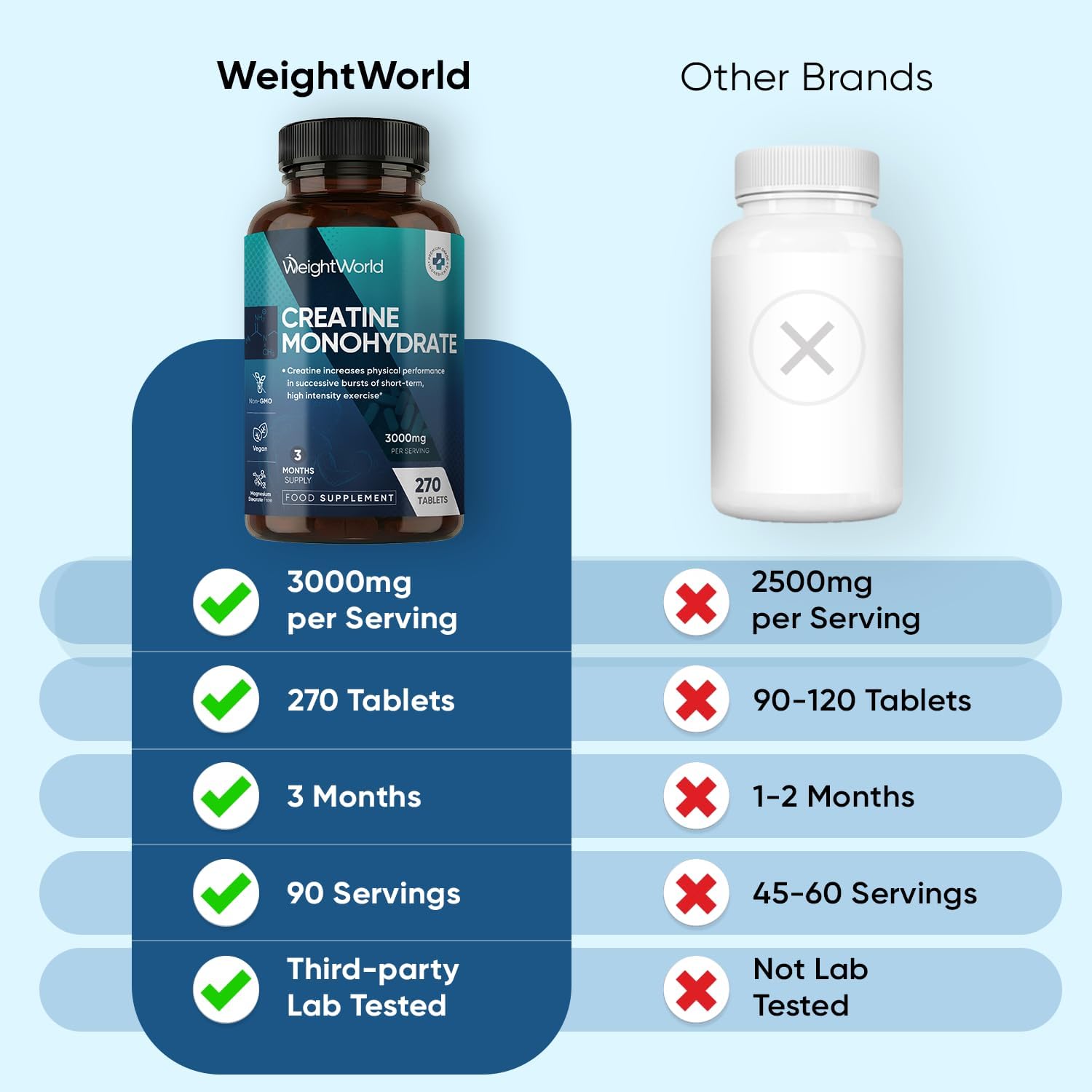• 270 TABLETS - 3 MONTHS SUPPLY: Each bottle contains 270 creatine monohydrate tablets, providing a whole 3-month supply. Designed for convenience, these creatine tablets offer a mess-free way to take creatine without any measuring or mixing required. Whether at home, at the gym, or on the go, they make creatine intake easy, turning it into a hassle-free addition to daily life.