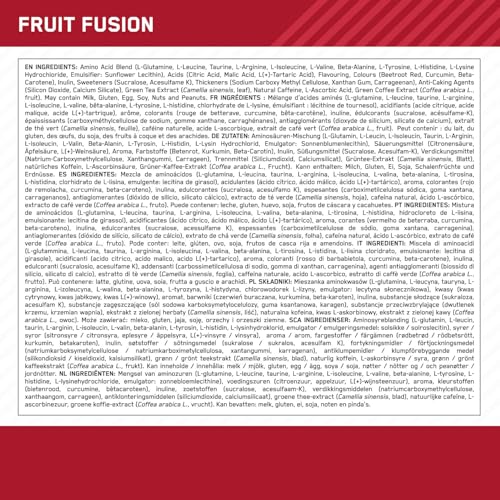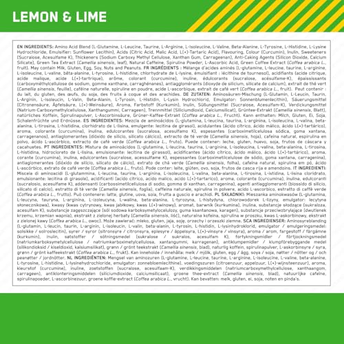 Amino Acid Blend (L Glutamine, L Leucine, Taurine, L Arginine, L Isoleucine, L Valine, Beta Alanine, L Tyrosine, L Histidine, L Lysine Hydrochloride), Emulsifier (Sunflower Lecithin), Acids (Citric Acid, Malic Acid, L Tartaric Acid), Flavouring, Colours (Beetroot Red, Curcumin, Beta Carotene), Inulin, Sweeteners (Sucralose, Acesulfame K), Thickeners (Cellulose Gum, Xanthan Gum, Carrageenan), Anti Caking Agents (Silicon Dioxide, Calcium Silicate), Green Tea Extract (Camellia sinensis leaf), Natural Caffeine, L Ascorbic Acid, Green Coffee Extract (Coffea arabica L fruit)