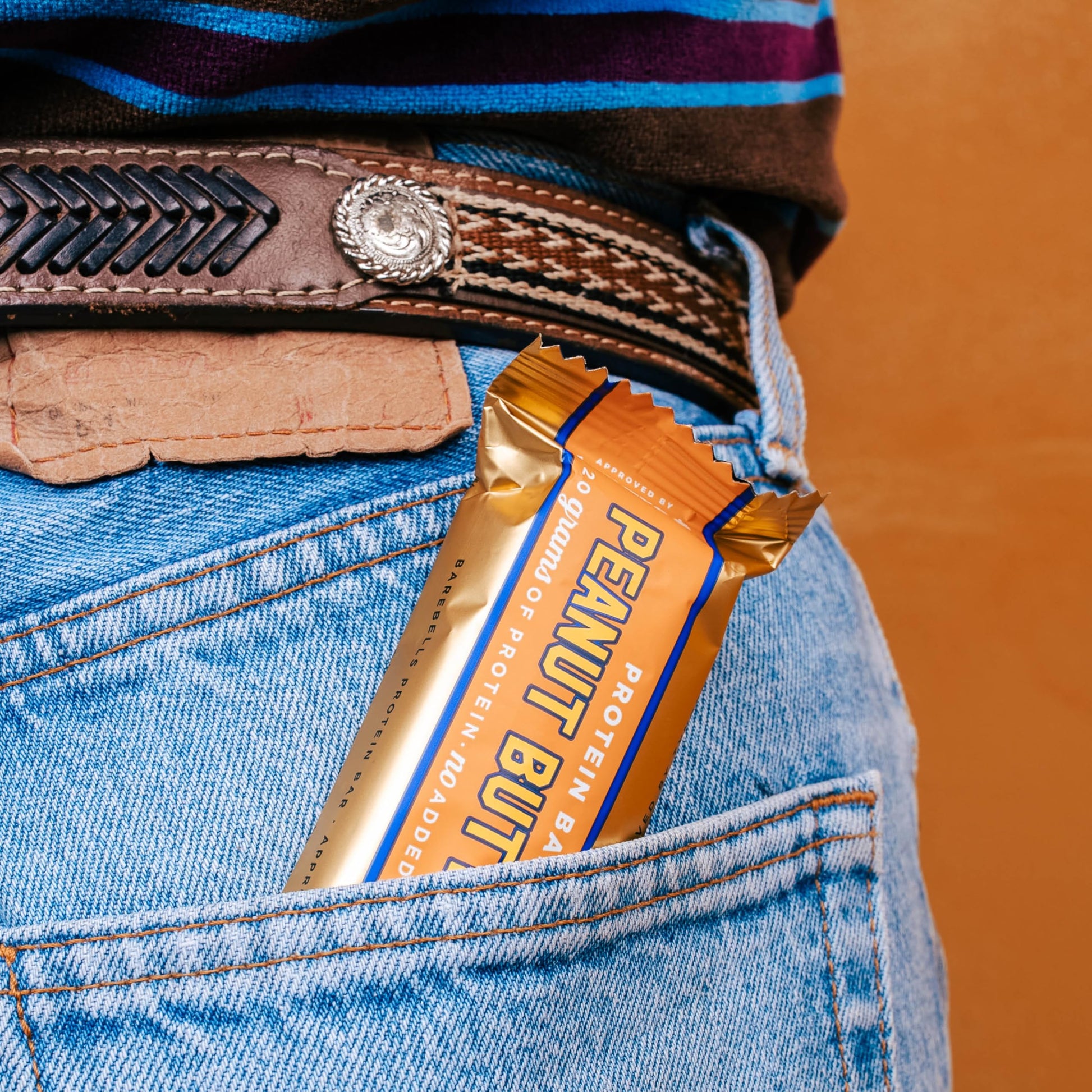 Protein bar with peanut butter filling on pink background. Wrapper partially visible with some text. Crumbly texture of bar filling shown.