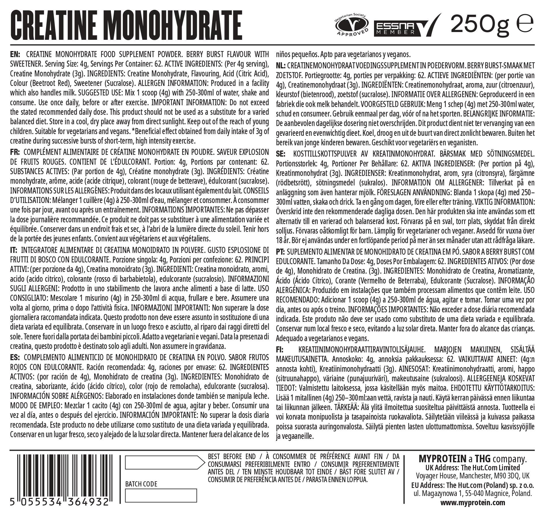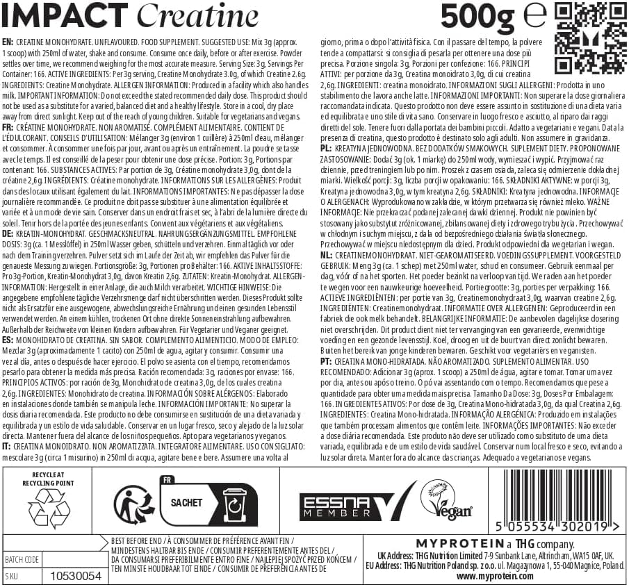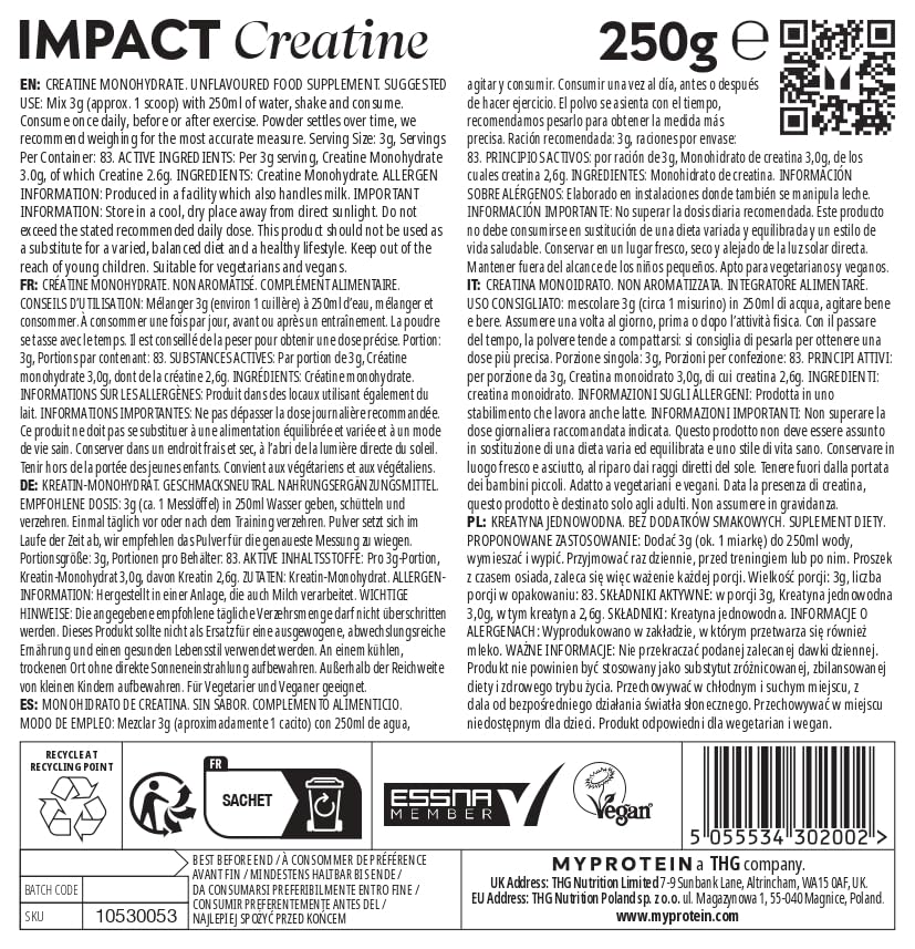 Ready to power up your workouts? Myprotein Impact Creatine Monohydrate Powder is your secret weapon for smashing heavy sets and cranking out extra reps with zero regrets. Each scoop delivers a science-backed 3g of creatine to supercharge your strength, power, and muscle endurance — perfect for those explosive gym sessions, resistance training days, and sprint intervals that leave you buzzing. Loved by over 5,000 athletes worldwide, this micronised, unflavoured powder mixes like a dream with water or your favourite shake, leaving no clumps and no funky flavours—just pure performance fuel. Crafted by experts and tested by pros, it’s the trusty sidekick every gym warrior needs!