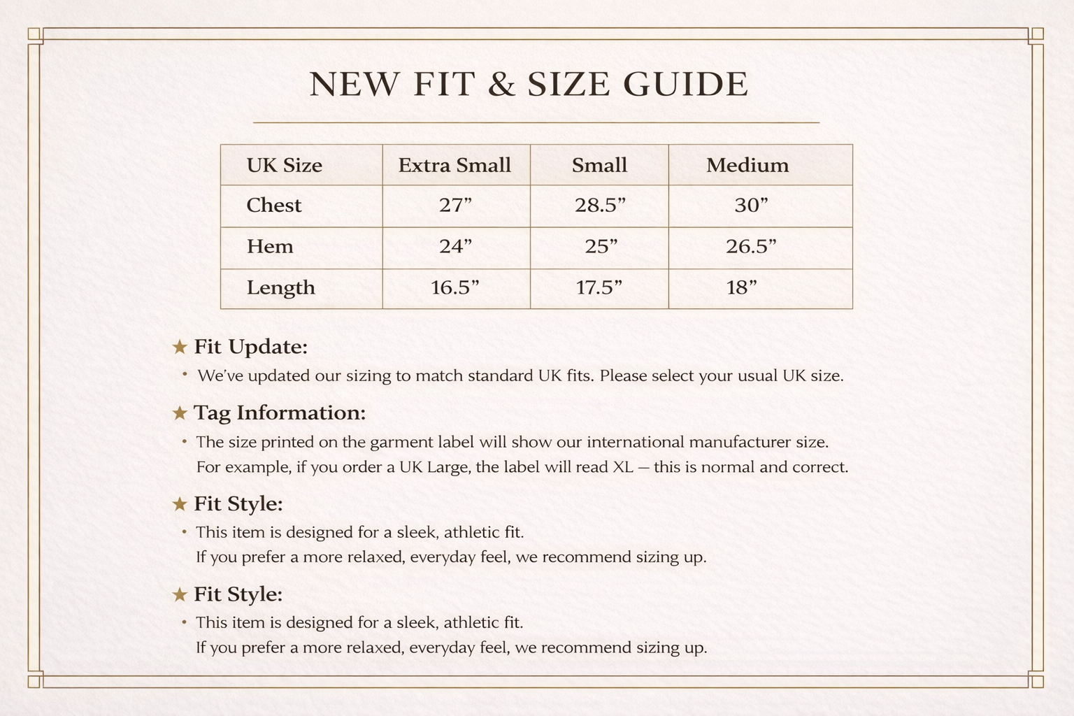 • Asian sizes typically run 1–2 sizes smaller than UK sizing.