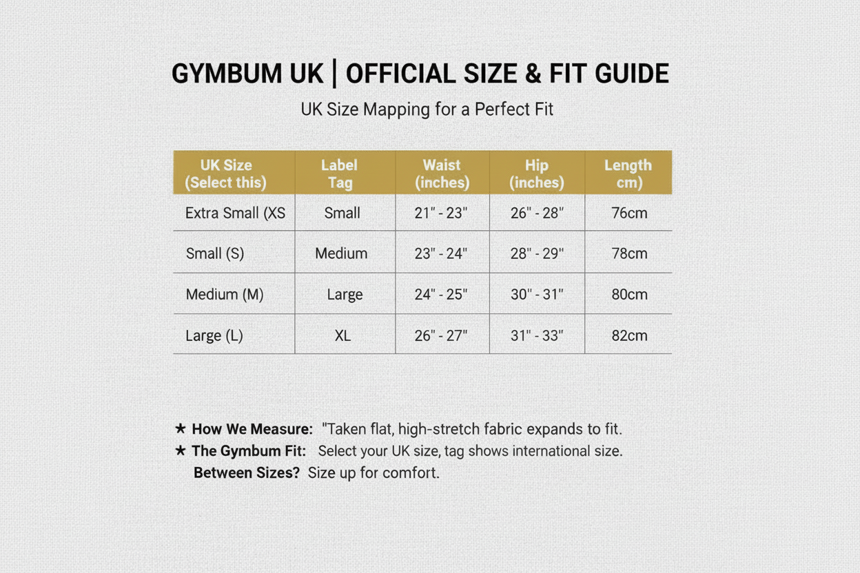 Fit Tip: Some of our activewear follows Asian sizing (approx. 1–2 sizes smaller than UK). Refer to the GymBum Size Guide for accurate conversions.