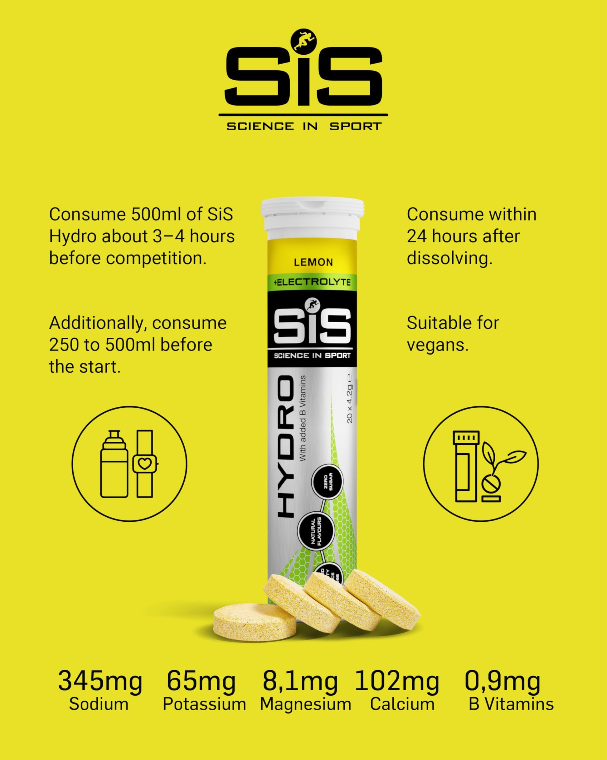 Add one SiS GO Hydro tablet (4.5g) to 500ml of water and let it dissolve. Once prepared consume within 24 hours. SiS GO Hydro should be used as part of a balanced diet and healthy life style. It is not intended as a weight loss product.