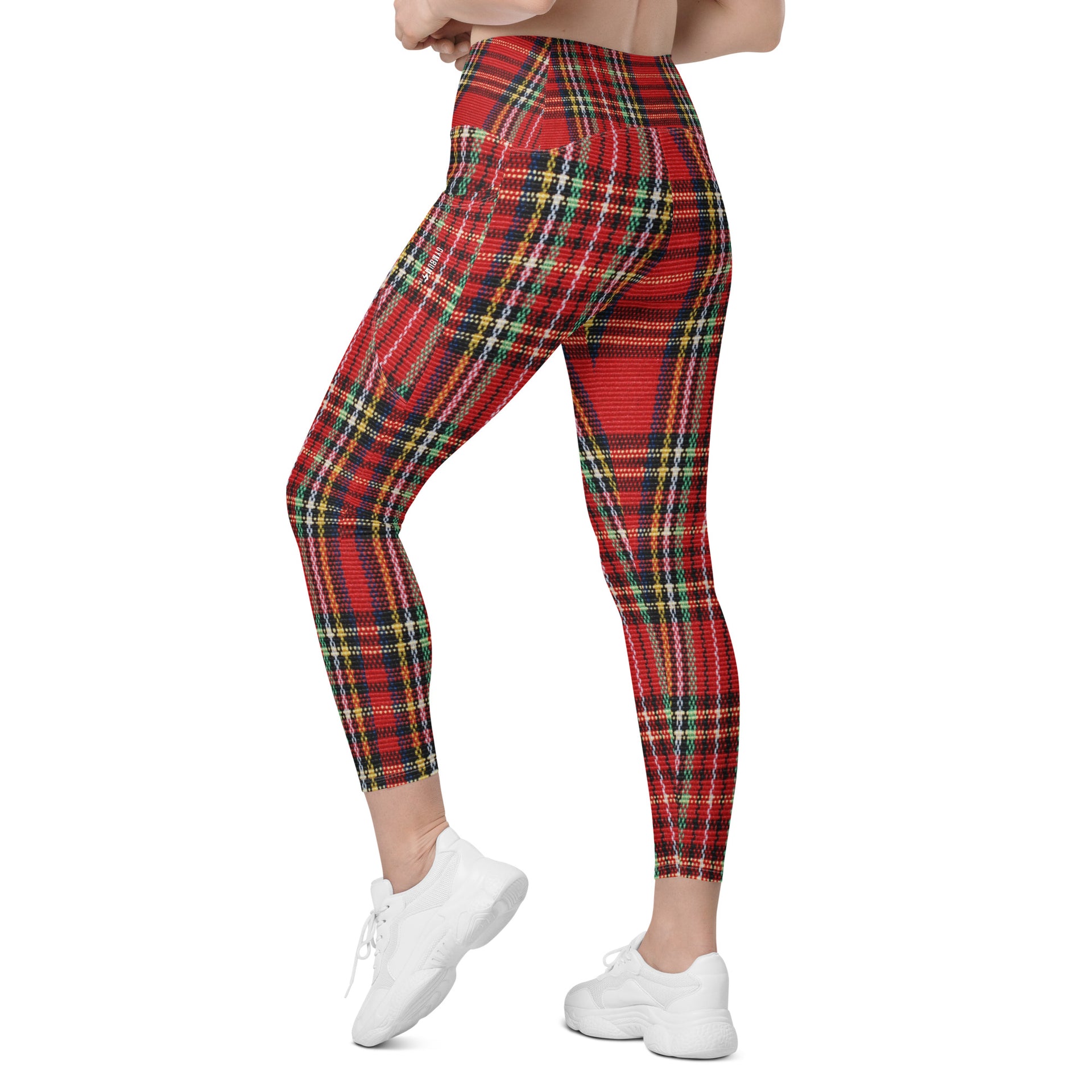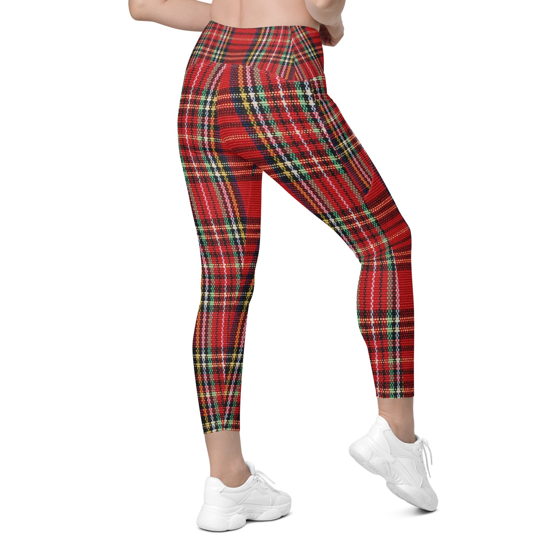 The bold red tartan print adds a timeless and stylish touch, while the convenient side pockets provide ample storage for your essentials. Made from a soft, stretchy fabric, these leggings offer exceptional comfort and freedom of movement, making them perfect for running, yoga, gym sessions, and casual wear.